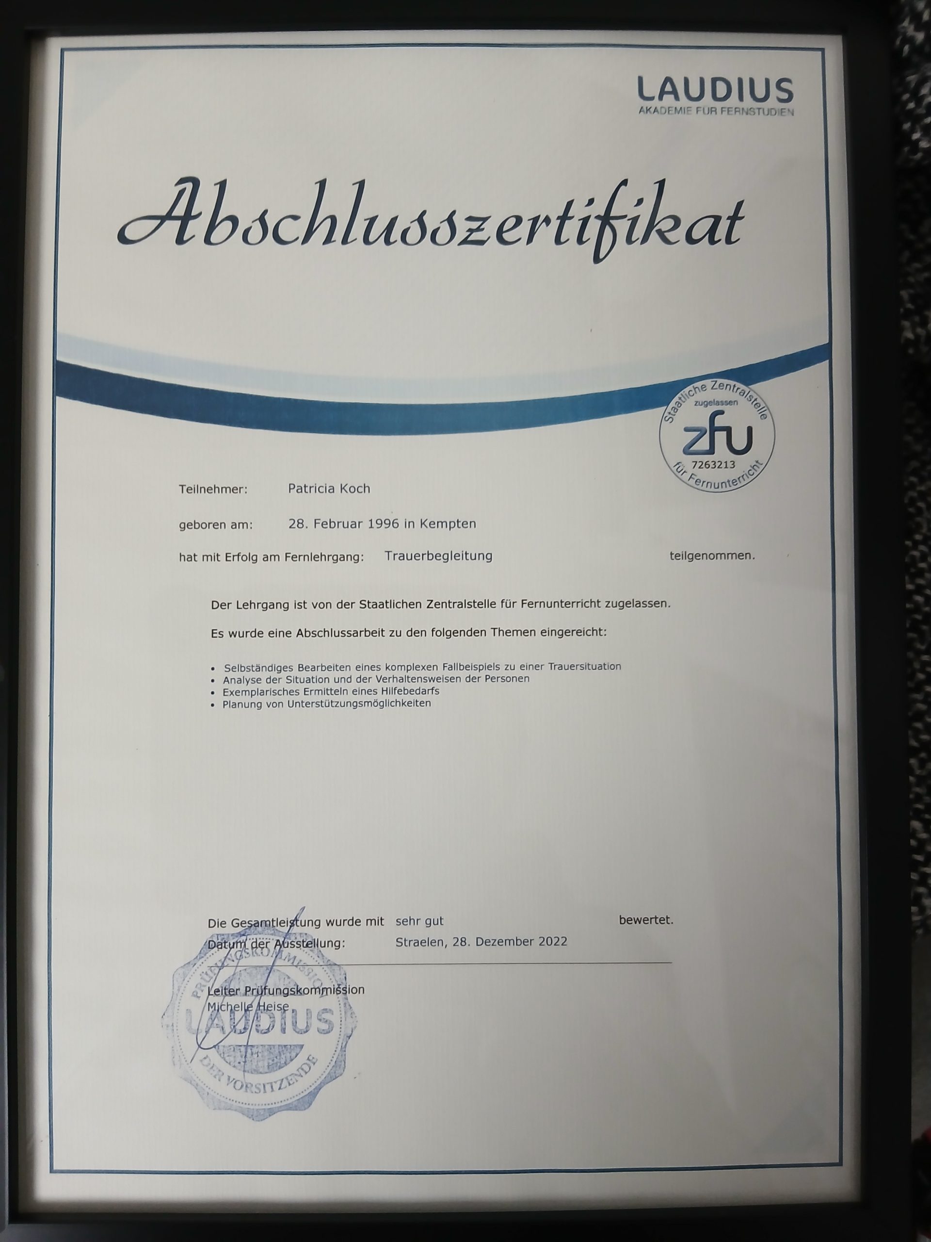 Mein Name ist Patricia Koch, ich bin 29 Jahre alt und examinierte Altenpflegerin. Neben meiner selbständigen Tätigkeit als staatlich anerkannte Trauerbegleiterin arbeite ich als Pflegefachkraft in einer Reha-Klinik.